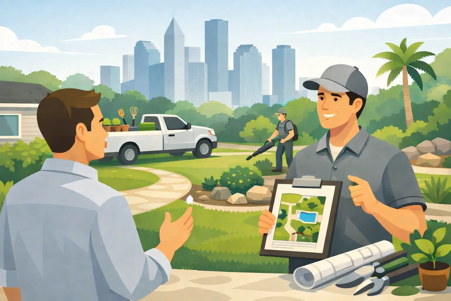 Houston landscape contractor discussing design plan with homeowner while crew works in yard